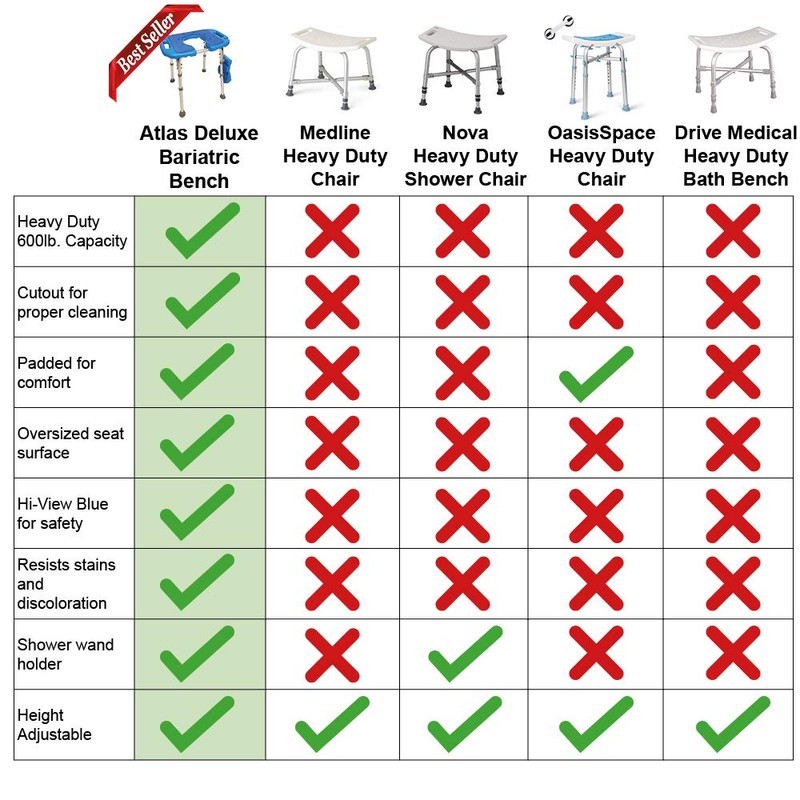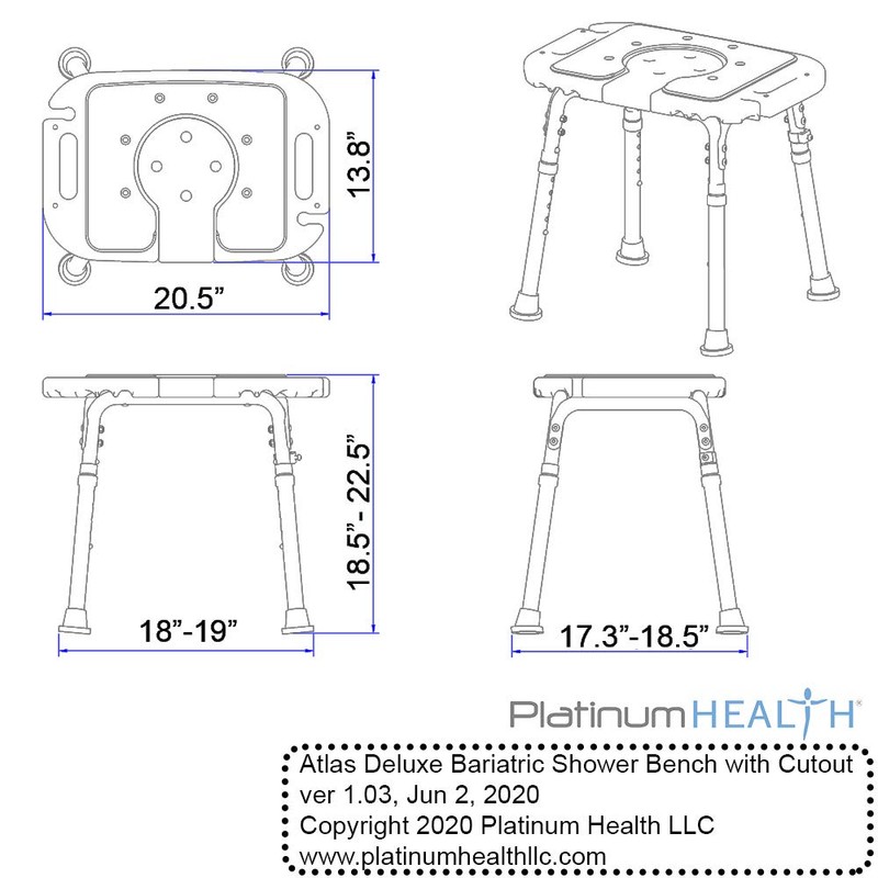 - EXTRA-LARGE SEAT SURFACE- A generous overall seat surface dimension of 20.5 x 13.5 inches is the LARGEST SEAT SURFACE AVAILABLE in this type of bench. Carefully compare to dimensions of competitive benches, what could be more important in a bariatric shower bench that an OVERSIZED SEAT? Seat surface also includes integrated shower wand holder for overall safety and convenience.