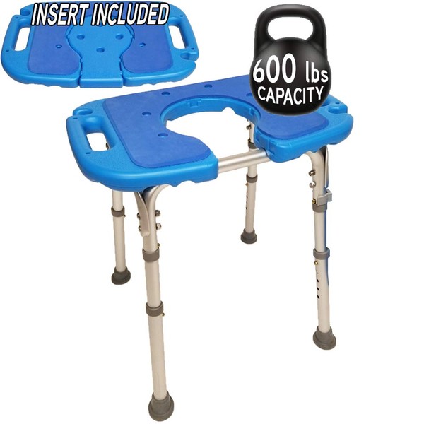 Atlas Deluxe Bariatric Shower/Bath Bench, 600lb. Capacity, Padded with Cutout and Insert. Heavy Duty Shower Chair/Stool with Adjustable Height and XL Seat