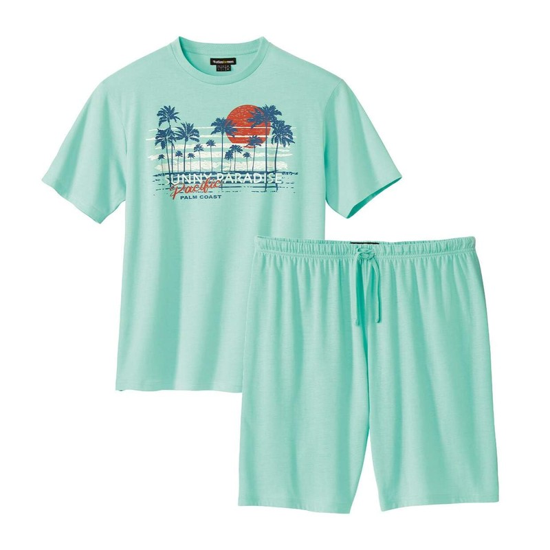 Short comfortable pyjamas: these are the pyjamas for balmy summer nights! In cuddly and comfortable jersey (approx. 145 g/m²), you can dream of the surfing mood, which the wonderful chest print shows. The short-sleeved top has a crew neck with ribbed cuffs and a neck band. The shorts are equipped with a comfortable elastic waistband including adjustable cord. Double stitched finish. 100% cotton. Back length for size L: approx. 74 cm. Inseam length: approx. 25 cm. Leg width: approx. 29 cm. Machine washable at 30°C. Iron inside out for printing. Colour: water green