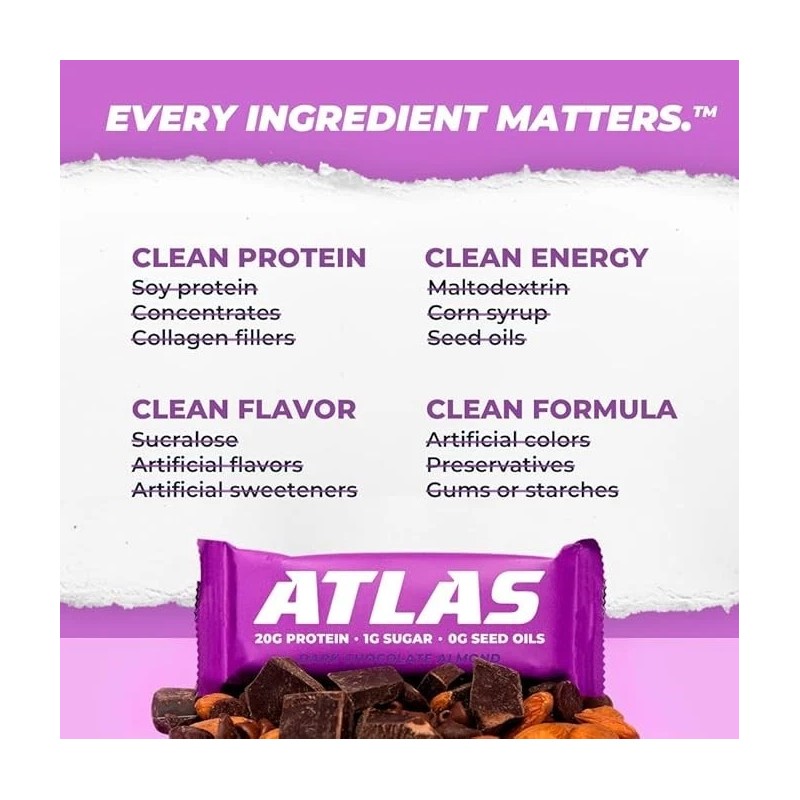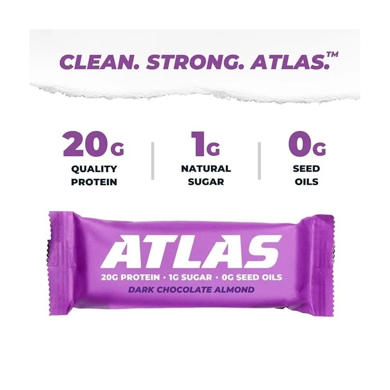 Atlas Protein Bar 20g Protein 1g Sugar Gluten Free Dark Chocolate Almond 12 Count