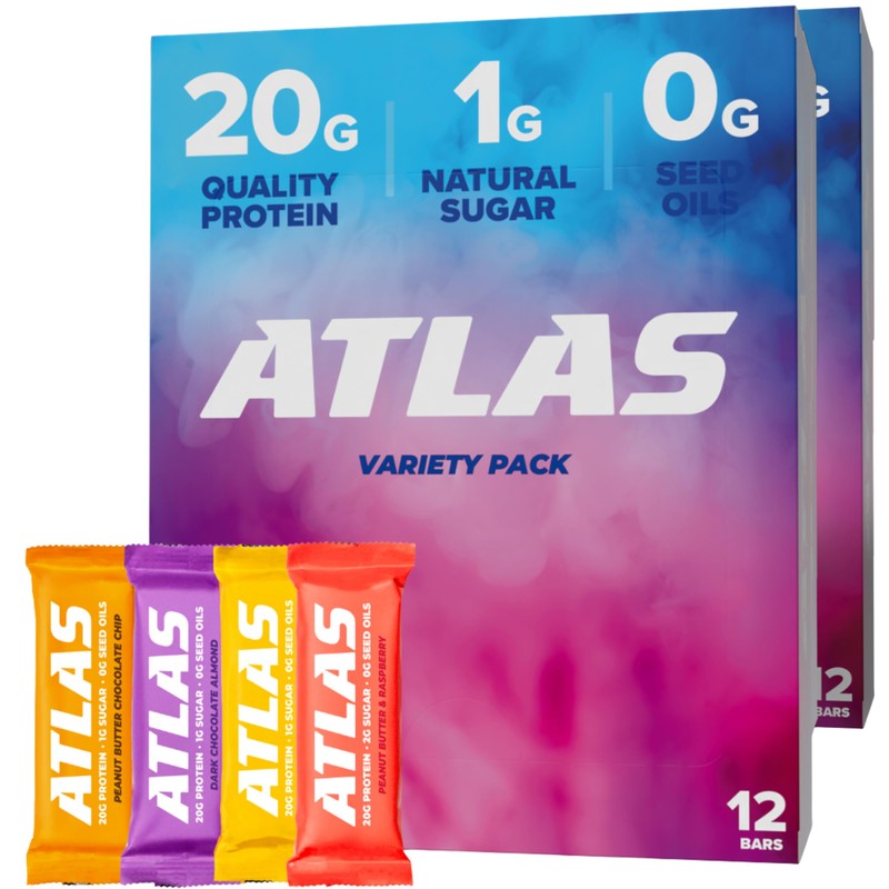 - EXCEPTIONAL NUTRITION: With 20g of quality protein and just 1g natural sugar, our bars are a nutritional powerhouse made from clean, natural ingredients that will keep you feeling your best throughout the day. NOTHING ARTIFICIAL: We believe in keeping things pure and simple. Our bars are free from artificial flavors, colors, preservatives, and sweeteners. With Atlas, you can rest easy knowing you're fueling your body with quality, natural ingredients.