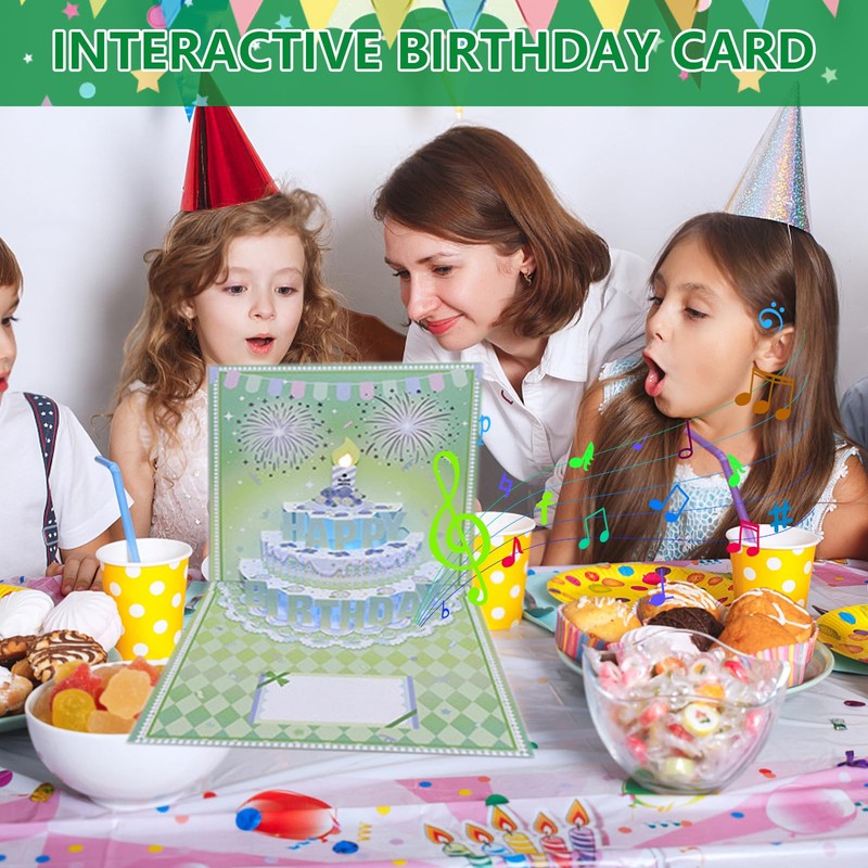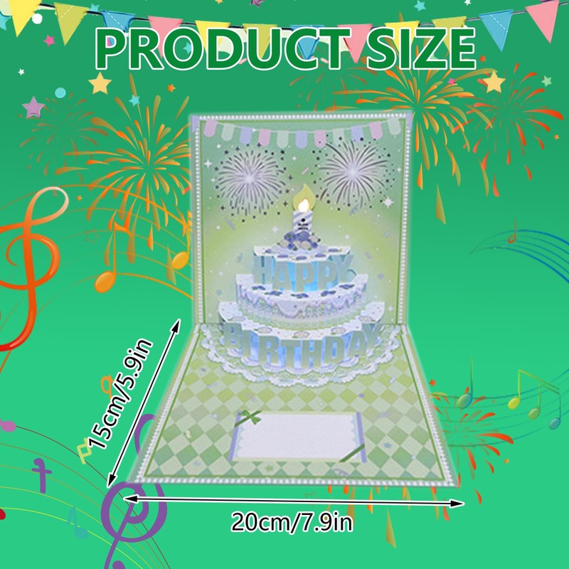 - Magic Music Birthday Card: Open the card to reveal a 3D Pop-up Birthday Cake with colorful fireworks lighting up, accompanied by the sound of fireworks and a Happy Birthday song