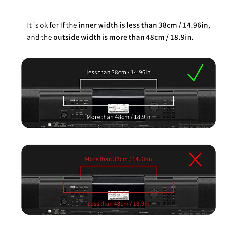 - For other brand keyboards, Please measure the size of the music score stand slot of your keyboard before purchasing. It is ok for If the inner width is less than 38cm / 14.96in, and the outside width is more than 48cm / 18.9in. If the two requirements can't be met at the same time, it will not be compatible.