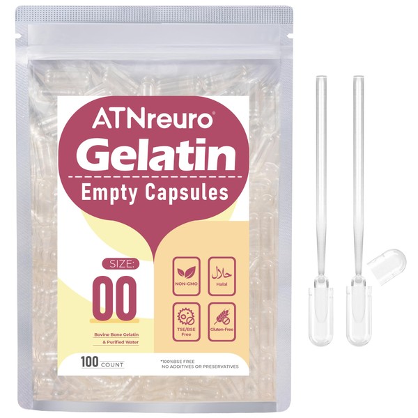 ATNreuro Size 00 Empty Gelatin Capsules with 2 Micro Spoons - 100 Count Empty Clear Capsule - Gel Pill Capsules for Powders Supplements
