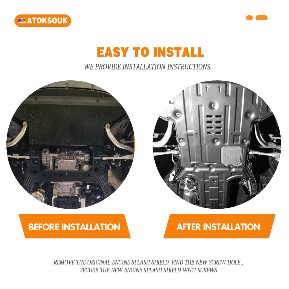 Remove the original engine splash shield, Find the new screw hole ,Secure the new engine splash shield with screws. Suggest professional installation, under normal circumstances, do not need to drill holes.the car model changes, may need to drill holes.