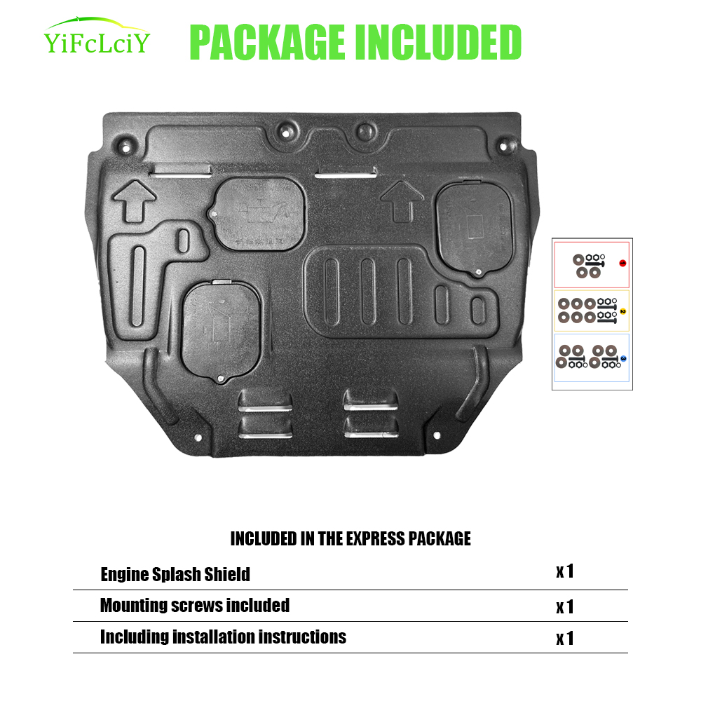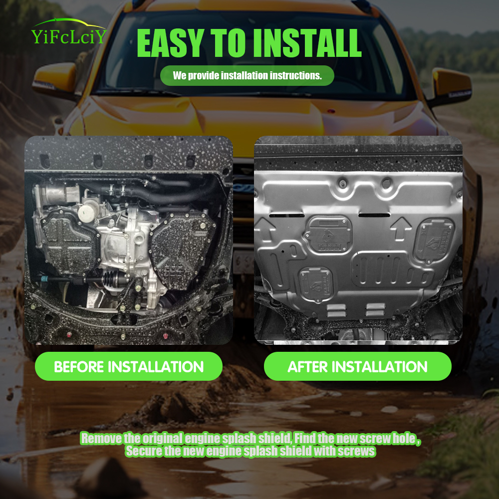 Remove the original engine splash shield, Find the new screw hole ,Secure the new engine splash shield with screws. Suggest professional installation, under normal circumstances, do not need to drill holes.the car model changes, may need to drill holes.