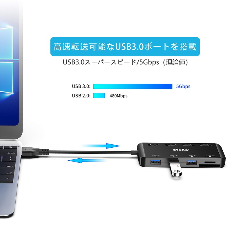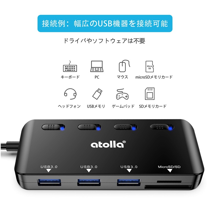 atolla USB 3.0 Hub SD Card Reader, 3-Port USB Hub 3.0 + SD Card Reader with On/Off Power Switch, 5Gbps High Speed Data Transfer, Lightweight, Compact, Compatible with Windows and MacOS
