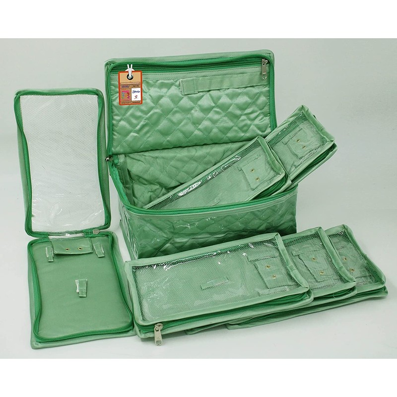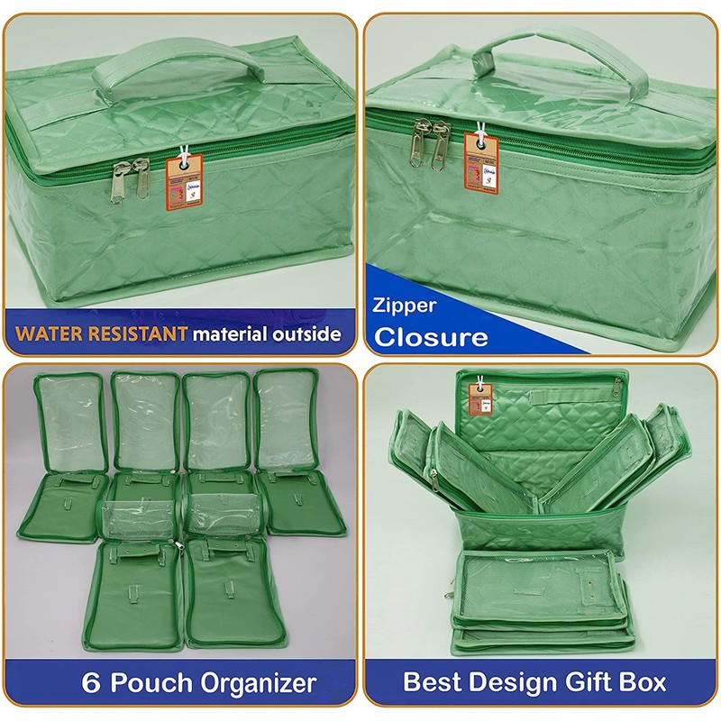- Color :- Mint Green, tailored with Satin Fabric And Transparent pouches, Dimensions: size: 25 x 15 x 12 Cm - Durable, Portable, Sophisticated and Stylish jewelry Bag, Convenient Jewelry Packing organizer