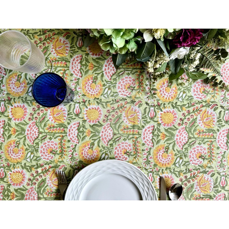 - QUALITY CRAFTSMANSHIP : Our Clover green table cloth floral design is inspired by the French Provencal Art. It is handmade using wooden blocks & printed by hand. Each table cloth is a a work of art and serves as a dining kitchen table cover and also as decor. Slight irregularities are inherent, it enhances the uniqueness of each tablecloth