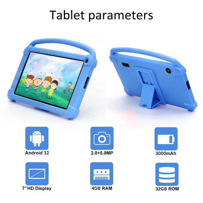 - 【A Full-feature Tablet for Kids】Kids tablet is equipped with the stablest Android 12 System, dual cameras with flash , 4GB RAM(Including 2GB of extended memory), 32GB ROM, which runs simultaneously, switch app launches quickly, smooth games and videos. Supports Micro SD card up to 512GB for more space to store your photos, music, movies, and videos. GMS certified Android tablet will let your kids download APP from Google Store more smoothly and safely, like YouTube , Netflix, Cocomelon, Disney+, ABC mouse etc .