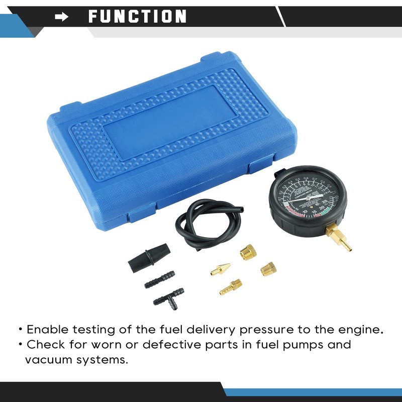 - Applications: This vacuum and fuel pump tester gauge kit tester will test fuel pump pressure and all vacuum operated devices, 4 tests can be performed – Fuel pump pressure, fuel pump vacuum, carburetor intake manifold, and vacuum test