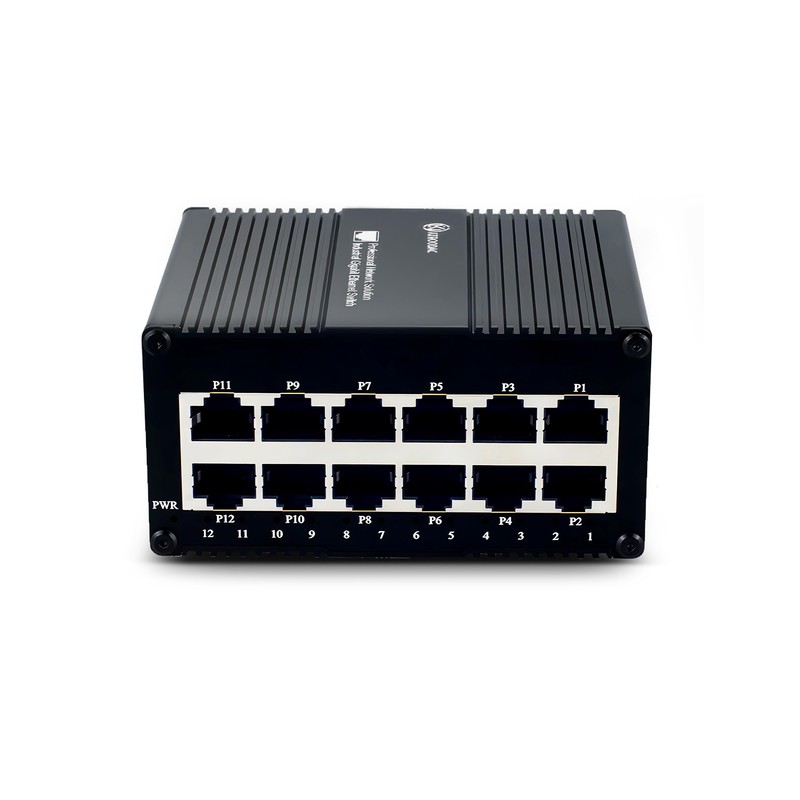 The industrial mini network switch has 12 Gigabit RJ45 ports and offers both IEEE802.3x traffic optimization and IEEE802.3az power saving functions,