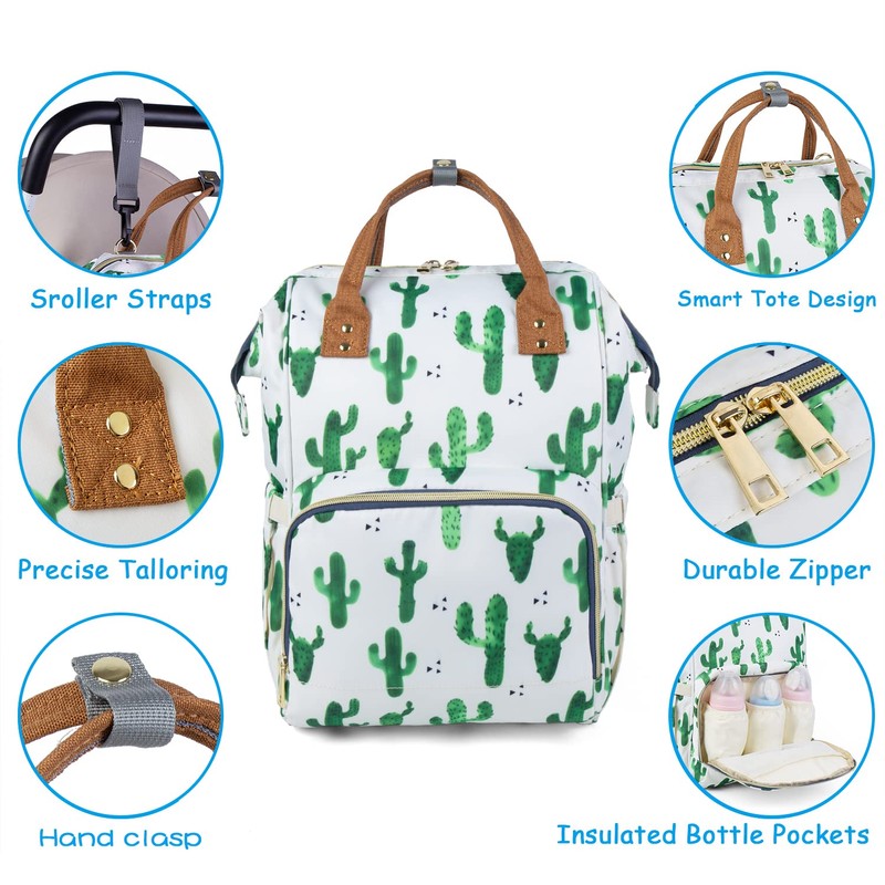 • Stylish & Convenient:Neutral Design Diaper Bag with stylish print (cactus print pattern). Hands-free by the Stroller Straps, One-Hand Controlling via the Easy-taking Zipper and the Outside Pockets without Opening the Big Zipper. It has both shoulder strap and hand-held strap, so you can use it as backpack or tote bags according to your needs.