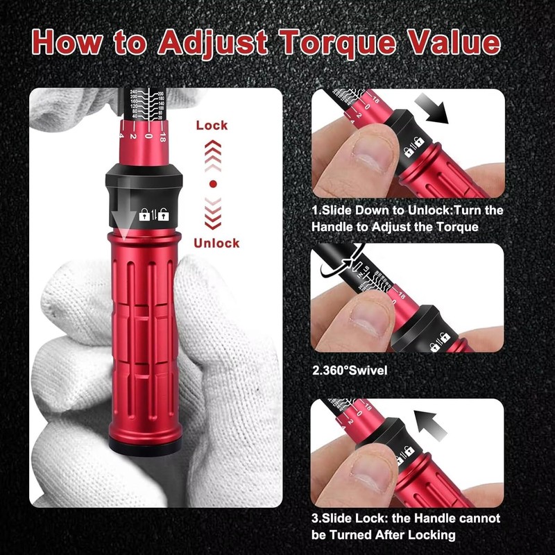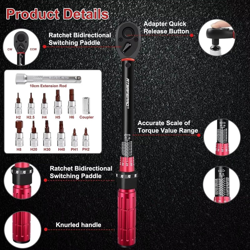 - 5. DUAL-DIRECTION DESIGN AND EASY-TO-USE:The torque wrench 1/4 ratchet head supports both clockwise and counterclockwise movement, featuring a quick-release button for effortless accessory changes. An audible “click” signals when the set torque is reached, preventing over-tightening and ensuring precision for every task.