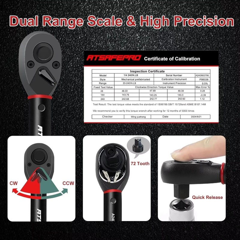 - 4. PRECISION AND READABILITY:The in lb torque wrench features a highlighted dual-range scale (inch-pound and foot-pound) for quick, accurate torque adjustments and a 72-tooth ratchet mechanism with a 5° swing arc, ensuring smooth operation even in tight spaces conditions.