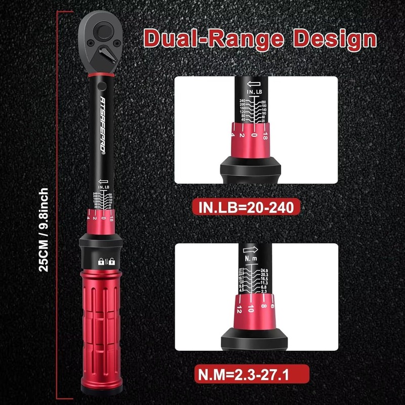 ATsafepro 1/4 Torque Wrench-20-240 in. lb/2.3-27.1 Nm, Inch Pound Torque Wrench for Bike, Bicycle Maintenance, 14 PCS Bike Torque Wrench Set | 72-Tooth Gear, Dual-Direction Click