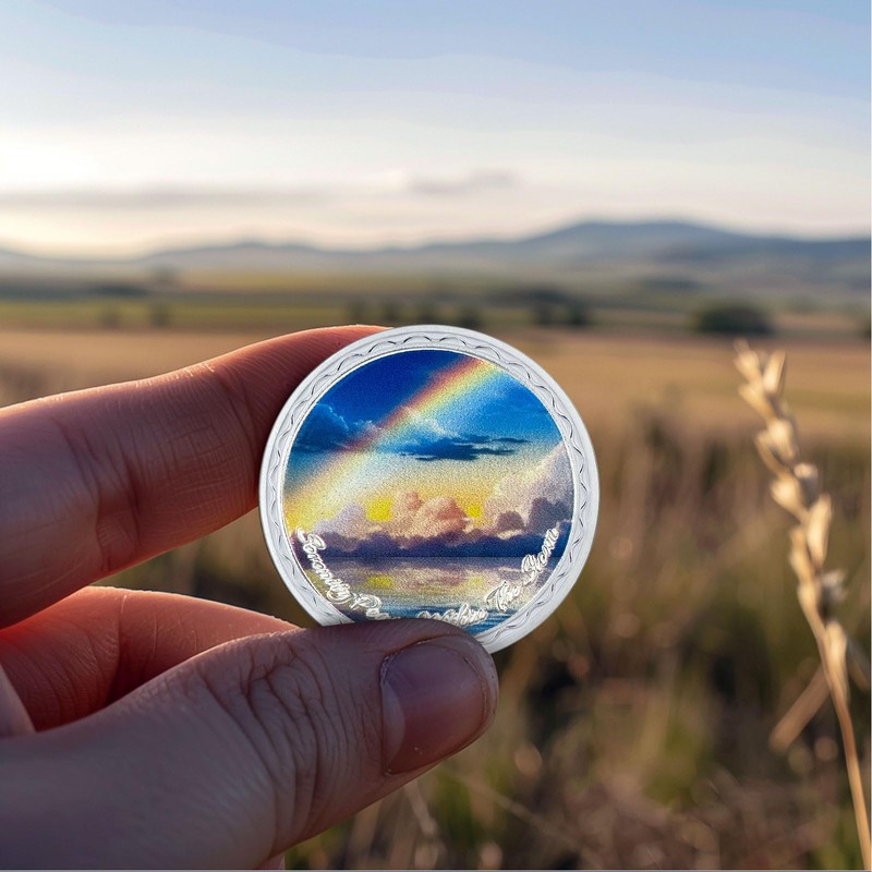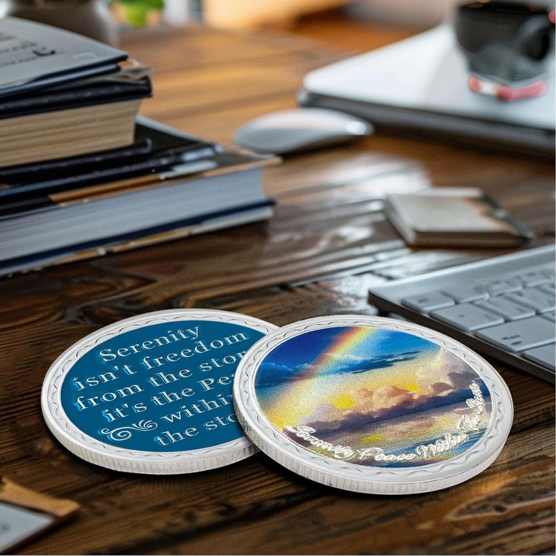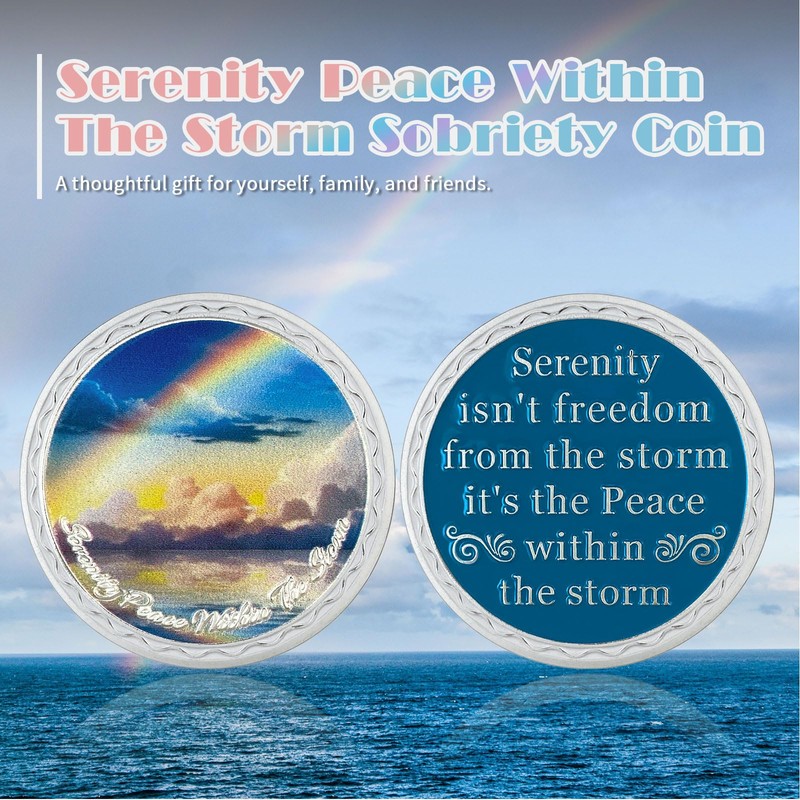 - ️BEAUTIFUL DESIGN There is a beautiful rainbow engraved on the front of the sobriety chip, which is reflected in the peaceful sea after the storm, bottom with the words: "Serenity Peace Within the Storm".