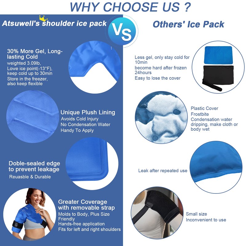 - Hands-Free Application: Atsuwell large shoulder ice pack filled with more gel with a lower freezing point to keep the shoulder ice gel pack cold for a long time. Two adjustable straps allow you to free your hands to enjoy ice compress. The reusable shoulder ice pack can be used sitting, standing, or lying down on your bed.