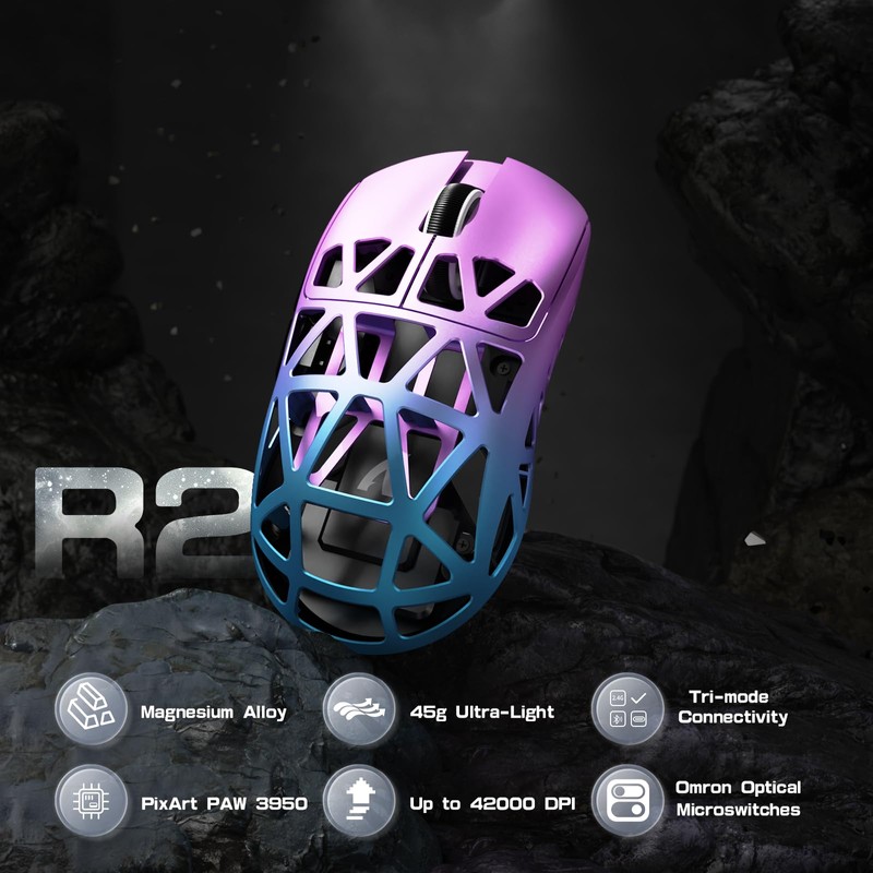- 【Spüren Sie Magnesium unter Ihren Fingerspitzen】Magnesium ist das leichteste Metallmaterial für die Struktur. Die R2 verwendet dieses hochwertige Metall und ist mit einem CNC-gefertigten Metallrahmen ausgestattet, der für eine perfekte Optik und hohen Komfort sorgt. Nicht zu vergessen ist das ausgehöhlte Design, das der Maus nicht nur eine einzigartige Ästhetik verleiht, sondern auch eine optimale Luftzirkulation garantiert, damit Ihr Griff auch bei den intensivsten Gaming-Sessions kühl bleibt.