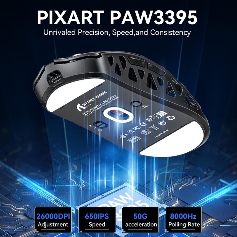 • 【PixArt PAW3395 & 100% Virgin Grade PTFE】Equipped with the PixArt’s latest PAW3395 sensor, providing top-notch accuracy and precision for fast-paced, competitive games, capable of 26,000 programmable DPI, 650 IPS speed, 50g acceleration. With zero-additive PTFE feet, give your mouse the most consistent slide ever, while providing better stopping power.