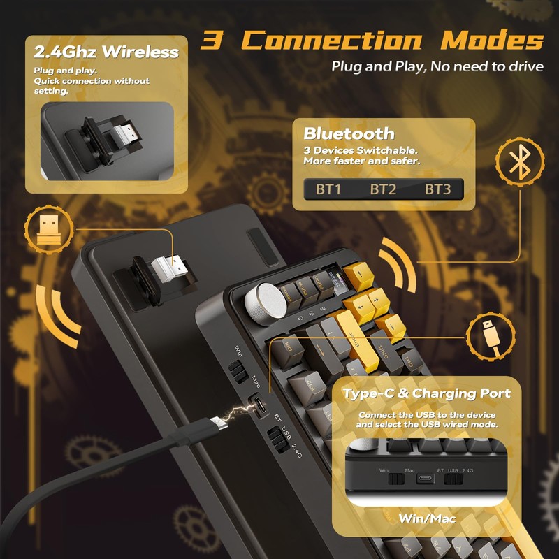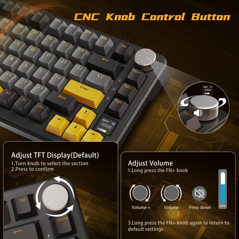 - [Custom TFT Smart Screen & CNC Knob]The X85 PRO gaming keyboard features with the creamy sound,can be used in dual modes.Usually,the wireless gaming keyboard with TFT screen displays:battery,time,system & connection mode etc.In gaming mode,rotate aluminum CNC knob to enter the screen menu(RGB backlight,volume & language etc),choose one you like.DIY GIF images of the TFT screen of the custom keyboard.In office mode,turn left or right or press down to control the volume independently.