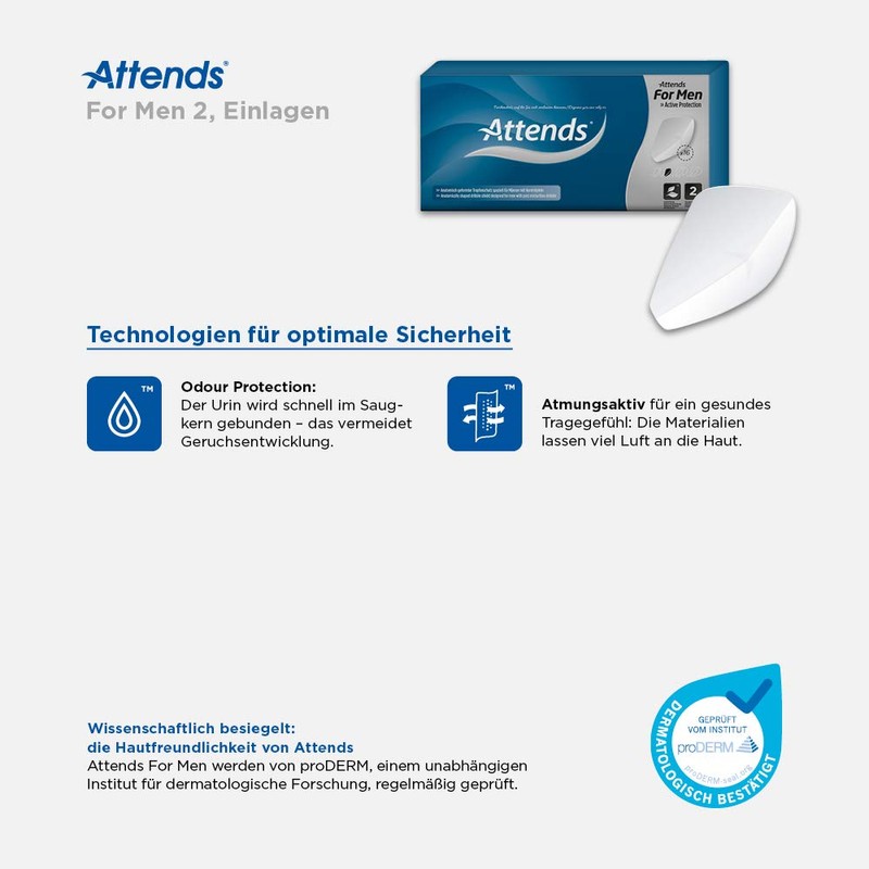 Attends For Men 2 (absorbency 2) - the insert for men with very light to light bladder weakness in pocket form - is a thin laundry protection for "night dribbling". Thanks to its fast fluid absorption, the product offers safety and a dry and gentle feeling. Attends Odour Protection prevents the formation of unpleasant odours. Attends for Men have an adhesive strip and should be attached to tight-fitting underwear or Attends fixing pants to ensure a secure fit. The product is a thin, inconspicuous yet absorbent pad at 2.6mm thickness. Latex free.