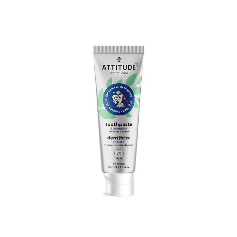 ATTITUDE Kids’ Toothpaste with Fluoride is perfect for teaching your little ones healthy dental hygiene habits, thanks to its delicious, natural blueberry flavor. This paraben-free and alcohol-free vegan toothpaste is made with plant and mineral ingredients. Since its formula contains fluoride sodium, this toothpaste helps prevent cavities and also protects your child's teeth from acid erosion when used regularly. Attitude's natural toothpaste helps rebuild fragile areas of the tooth and remineralize enamel.*