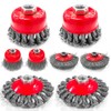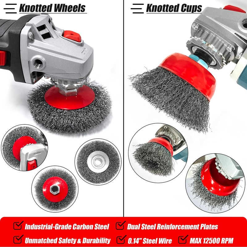 - Industrial-Grade Carbon Steel – Both wire wheel brush and cup brush are made of high quality carbon steel, 0.02" knotted & 0.014" crimped wires with dual steel reinforcement plates. Withstands 12,500 RPM for heavy-duty grinding without wire breakage.