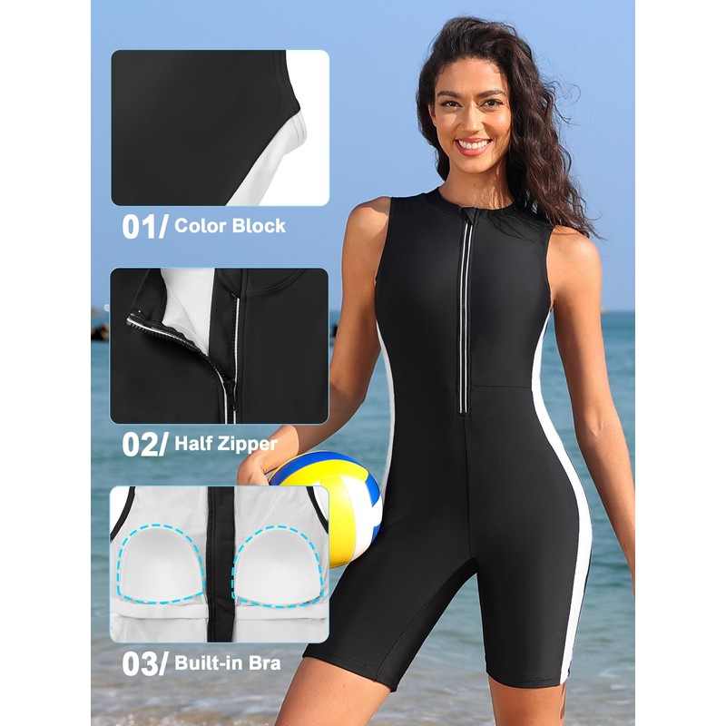 Featuring eye-catching color block and side splice, this swimwear creates a slimming effect that flatters your figure. The full back design adds a touch of elegance while providing conservative coverage. The half-zipper design makes it easy to put on and take off.