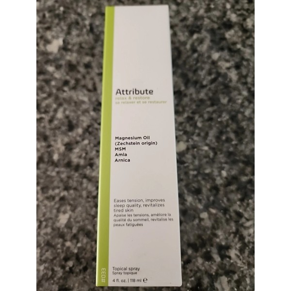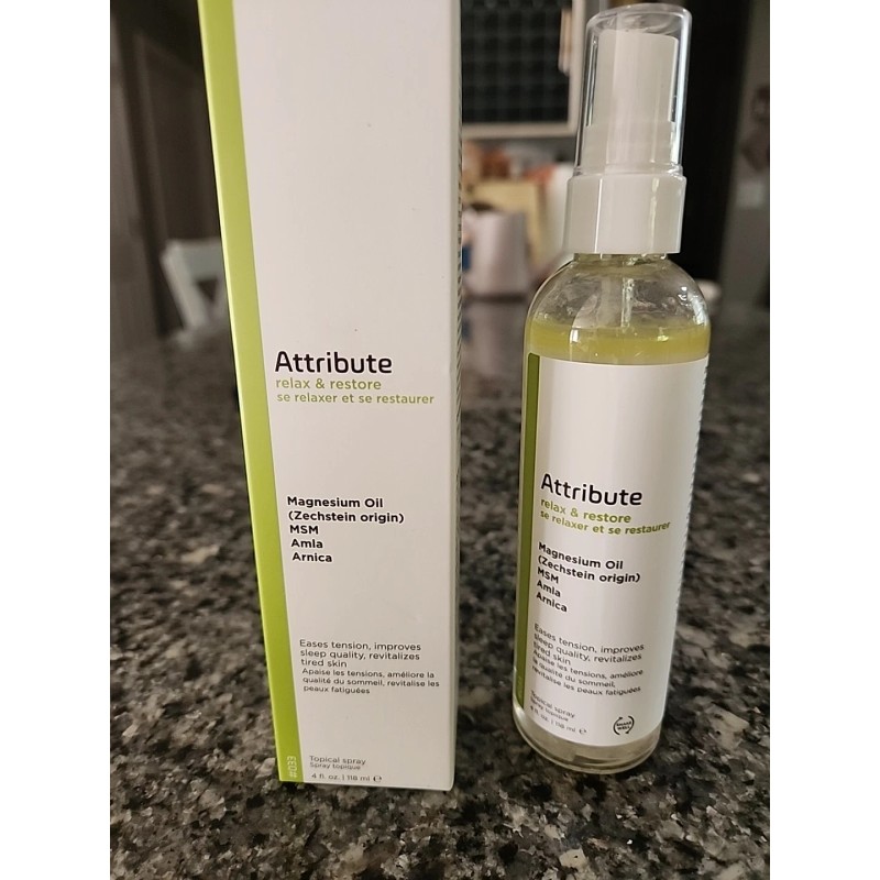 Attribute Magnesium Oil. Helps ease tension, improves sleep quality, revitalizes tired skin. Brand new in box.