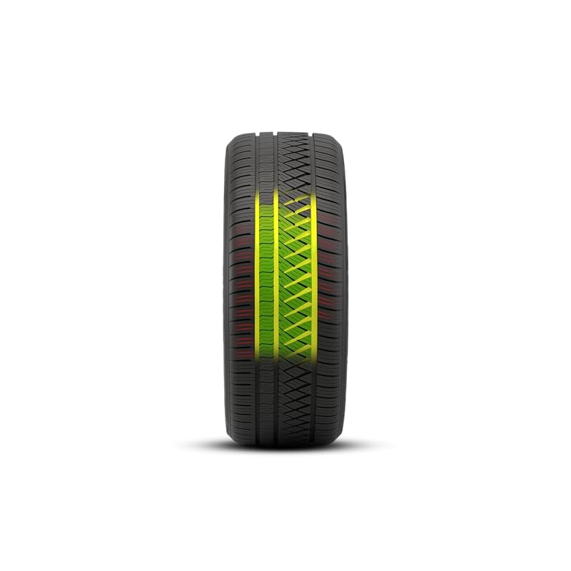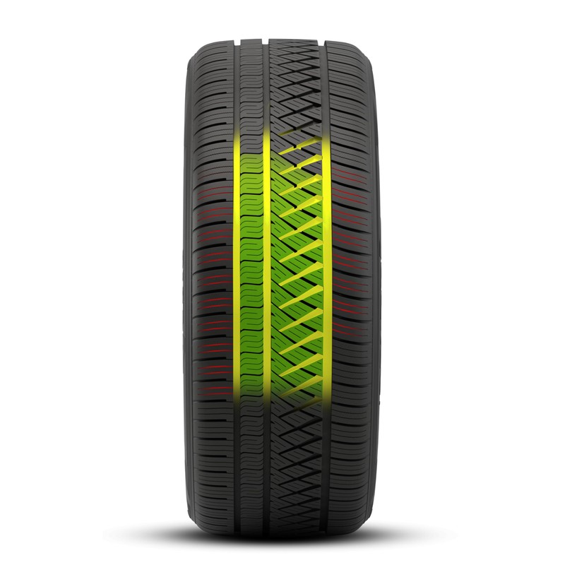 - Asymmetric tread design that provides grip in any weather whether moving straight forward or cornering.