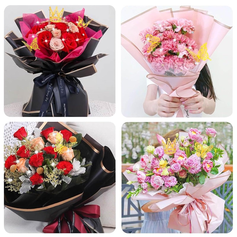 - Exquisite Designs: The paper for flowers bouquets features a delicate purple gold border and a translucent style that complements the sparkling crowns adorned with rhinestones. The 3D butterflies gracefully flutter their wings in the breeze, radiating a captivating lifelike beauty. Additionally, diamond-shaped floral pins contribute to a noble aesthetic. These accessories elevate your DIY flower wrapping paper bouquet, making them exceptionally eye-catching.