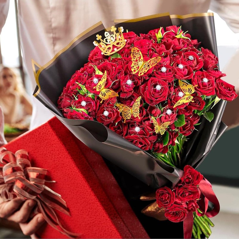 - Waterproof Material: Our bouquet wrapping paper is made of translucent plastic paper, which is waterproof, with a smooth surface and is not easy to wrinkle. The 3D butterflies and cards are made of paper material. The diamond pins are made of steel wire plastic and are not easy to bend. The crown is made of alloy and the ribbon is made of polyester material.
