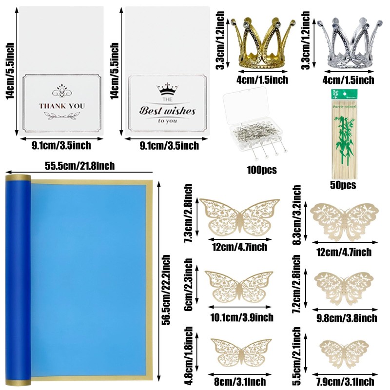 - Flower Wrapping Paper Set: You will get 60 sheets flower wrapping papers, 2 rolls flower tapes, 3 rolls satin ribbons, 24 sheets 3D butterfly decorations, 50 pieces bamboo stick, 6 pieces crown, 20 pieces greeting card, 100 pieces flower pins.