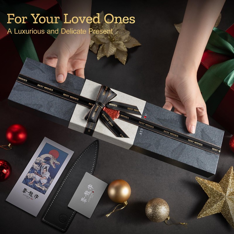 - An Exquisite & Luxurious Gift ChoiceHandcrafted premium Japanese chef knife, in an exquisite black gift box adorned with elegant feather patterns, complemented by a golden butterfly knot. Whether as a gift for Father's Day, Mother's Day, Christmas, or a Birthday, it is sure to delight the recipient and make them feel truly honored.