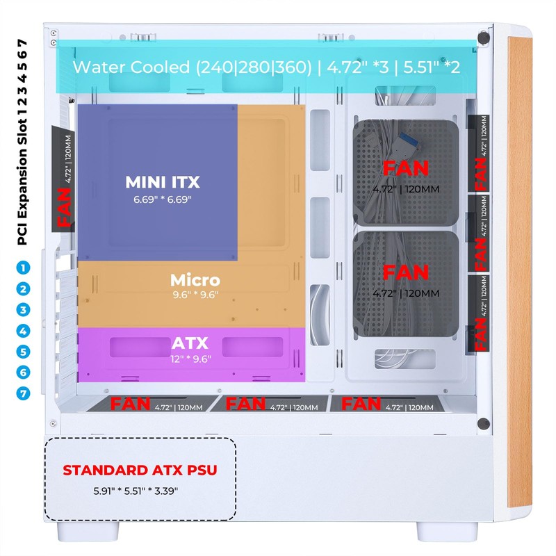 - Fits atx / micro atx / mini itx motherboards; Fits atx psu; Without controller required, one click control of fan lights on the chassis.