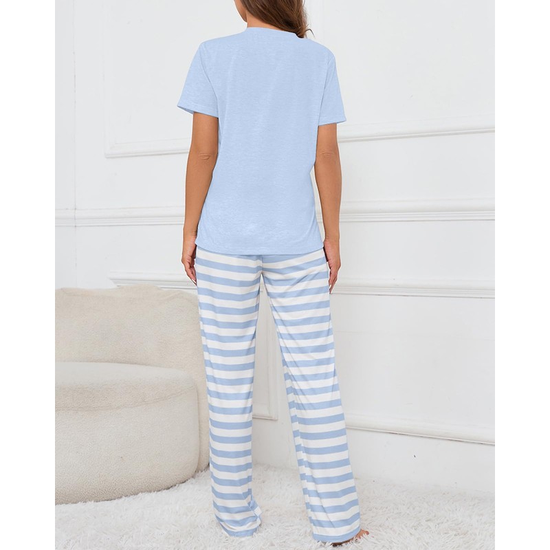 Atxnn Womens Pyjamas Cotton Pjs Set Round Neck Loungewear Striped Pants with Pockets Drawstring Nightwear Soft Chic Sleepwear Summer Spring, LIGHTBLUE XL