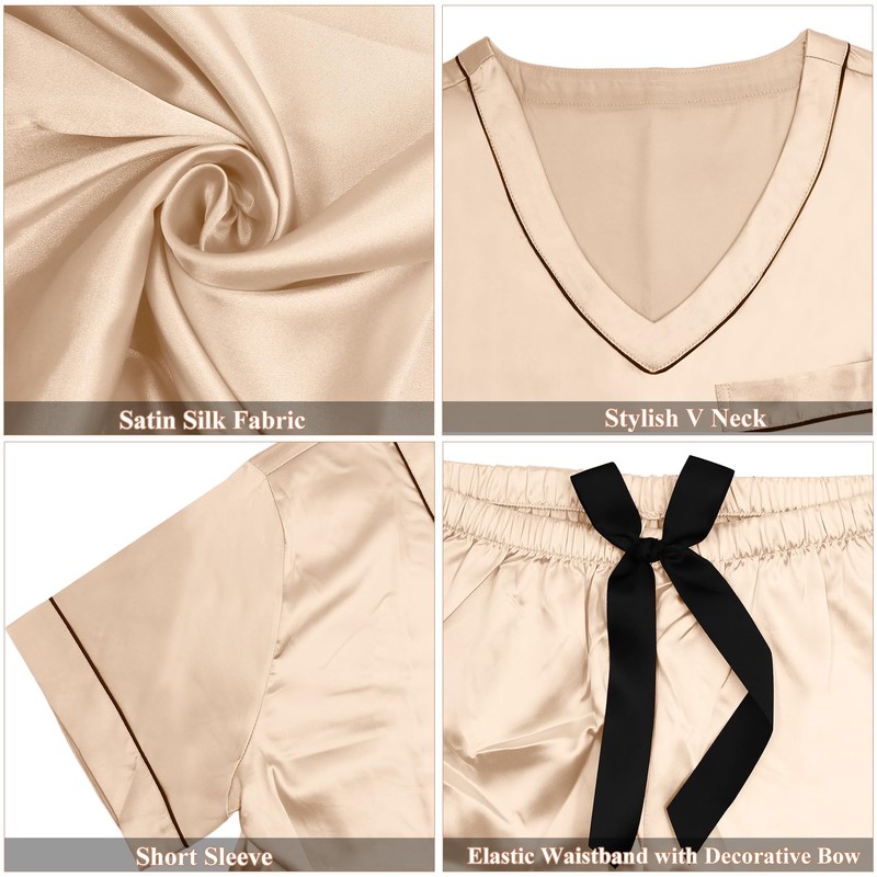 Atxnn Womens Pyjamas Silk Satin Pjs Set Summer V-Neck Loungewear Two Piece Soft Chic Nightwear Short Sleeve Top and Shorts Sleepwear Champagne