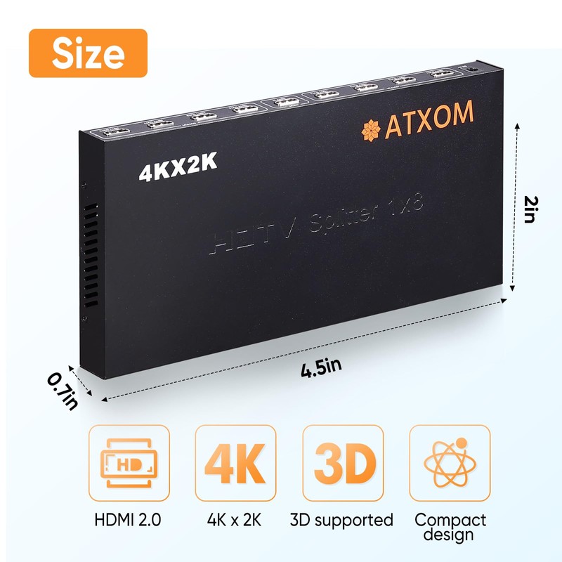 - 【Package Includes】- 1x8 HDMI splitter, user manual, 100-240V worldwide voltage power adapter. ATXOM prioritizes your satisfaction of the purchase: easy-to-reach customer service to solve your problems in a timely manner. If you have any questions, just contact us.