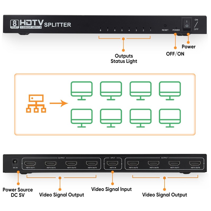 - 【Premium 4K HDMI Splitter 1 in 8 out】- This HDMI splitter duplicates one HDMI input source to eight output HDMI signals that display simultaneously and identical to the input signal up to 4K with no loss in quality (Note: This unit does NOT extend monitors). Supported resolution: up to 4K, 1080p, 720p, VGA to WUXGA.