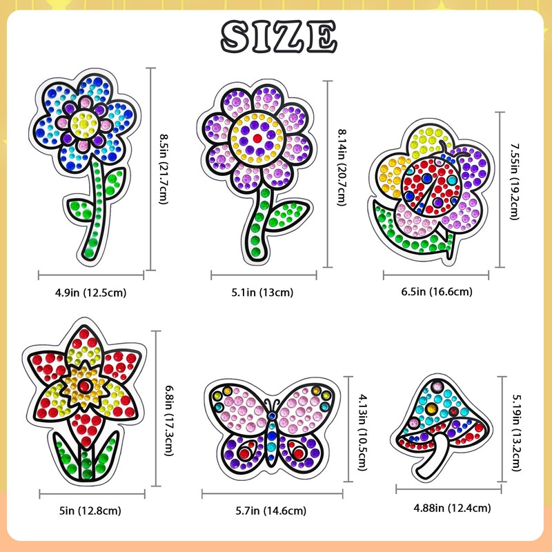 - Wonderful design: Suncatcher gem art diamond painting kits for children contain 6 sheets with different pattern designs, such as flower, butterfly, mushroom.