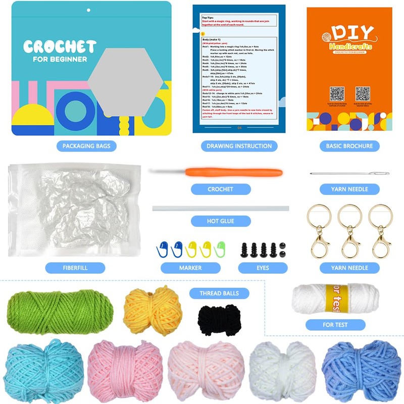 - 👍【COMPLETE BEGINNER CROCHET KIT】AUAUY crochet kit is very complete, you don't need to buy other accessories, it comes with 1 yarn needle, 1 crochet hook, 1 bag of stuffing, 3 keychains, 1 pack of stuffing cotton, 5 pieces of knitting Mark buckle, 6 eyes, 3*instruction manual, 1*operating manual, 1*colored paper, 9 rolls of yarn, 1 hot melt glue stick. The perfect beginners complete crochet set.
