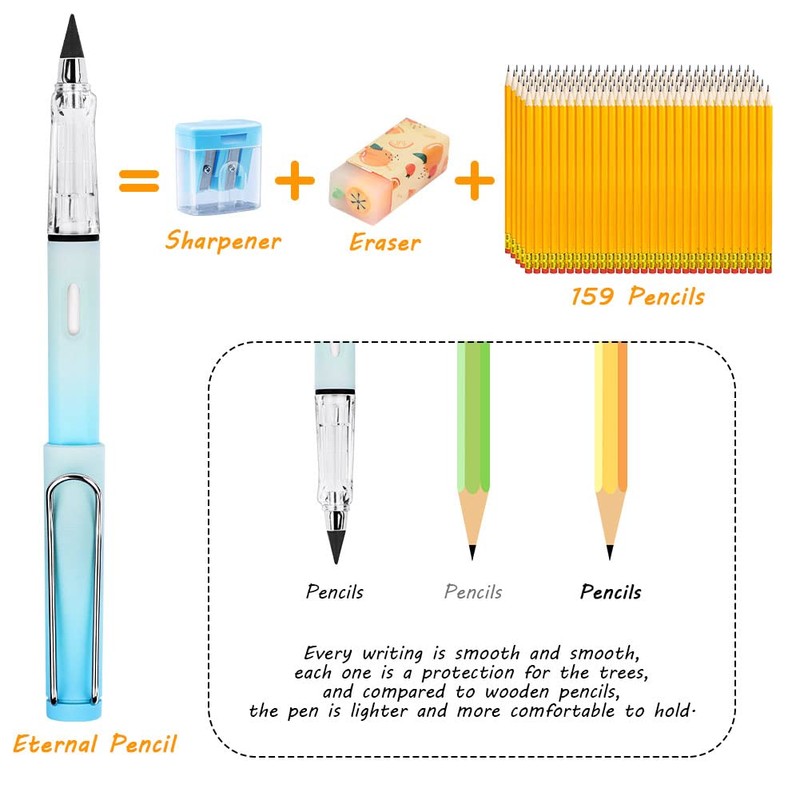- Inkless pencil set: this infinity pencil is made of graphite with clear and durable writing, which allows you to save time sharpening or adding ink and avoid the hassle of sharpening pencils. Complete your desk with this timeless pencil case in trendy gradients. This set contains not only pencils, but also erasers and replacement tips. A sufficient amount to meet your daily writing and replacement needs