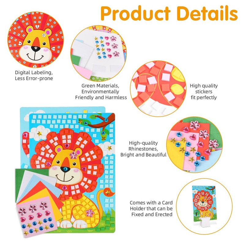 - ♻【SAFE AND ECO-FRIENDLY】Our sticker art kits are made of safe and environmentally friendly materials and require no other tools like glue and scissors, making them a mess-free, glue-free project for kids. Parents don't need to worry about toddlers hurting themselves or getting their fingers stuck together, they can create eye-catching mosaic art pieces with just their hands!