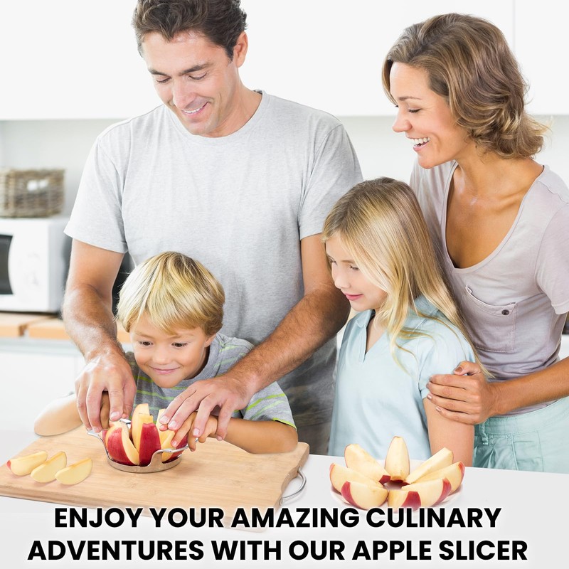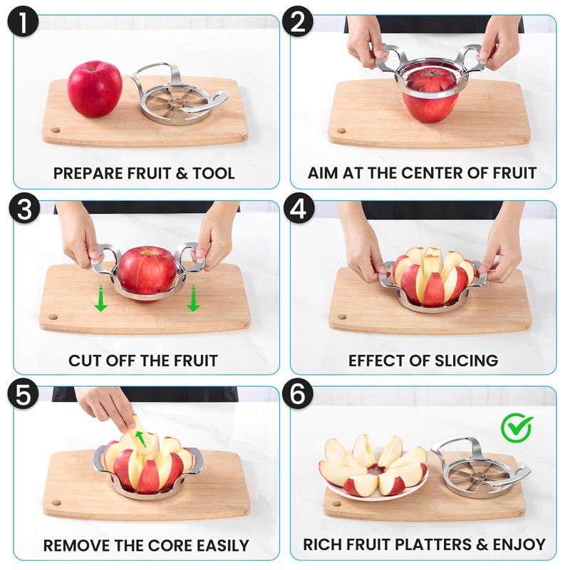 - EASY TO USE: Choose fruits less than or equal to 4.2 inches. Aim at the core, easily push down the slicer to core through it, slightly twist, and get rid of the core. Then you get 8 perfect apple slices right away! The ergonomic & smooth zinc-alloy grip will help you cut with ease. The ultra-sharp blade will bring you a great fruit cutting experience.
