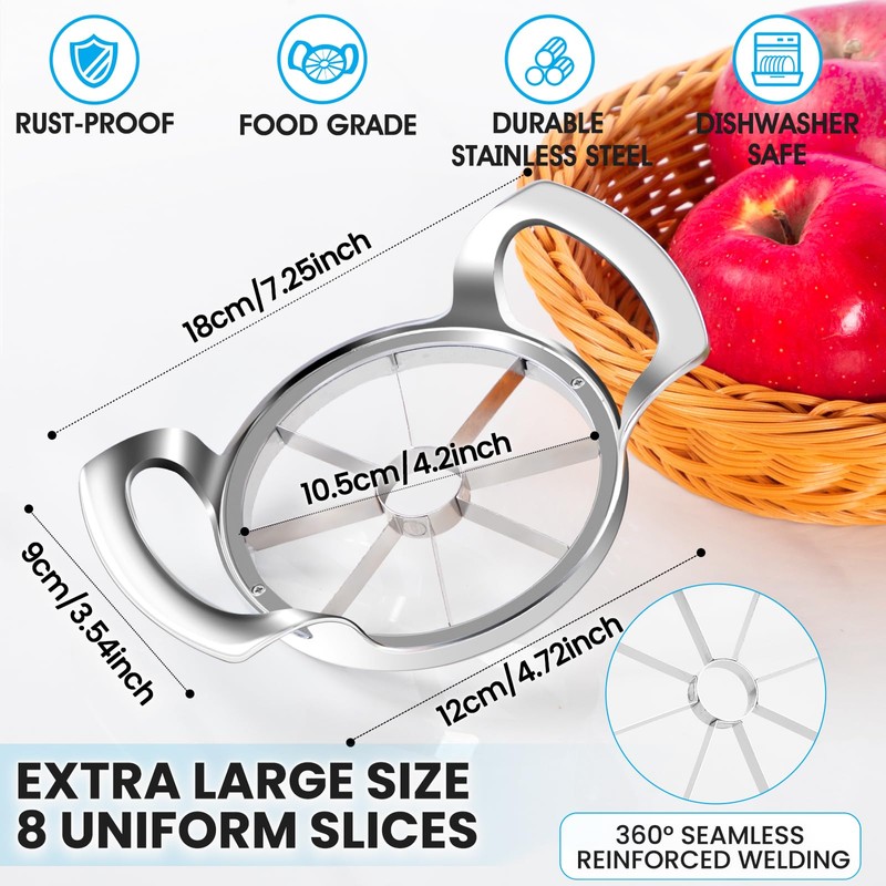 - AMAZING APPLE SLICER: Still struggling to cut and core apples? AUBENR Heavy Duty Apple Slicer features a 2-in-1 design, having 1 Corer and 8 Shape Blades. It helps you easily and perfectly cut fruits into 8 uniform slices in one simple motion. PS: This Apple Slicer is HEAVY DUTY, EXTRA LARGE with inner diameter 4.2 inch. The blade may be sharp, so be careful when you use it.