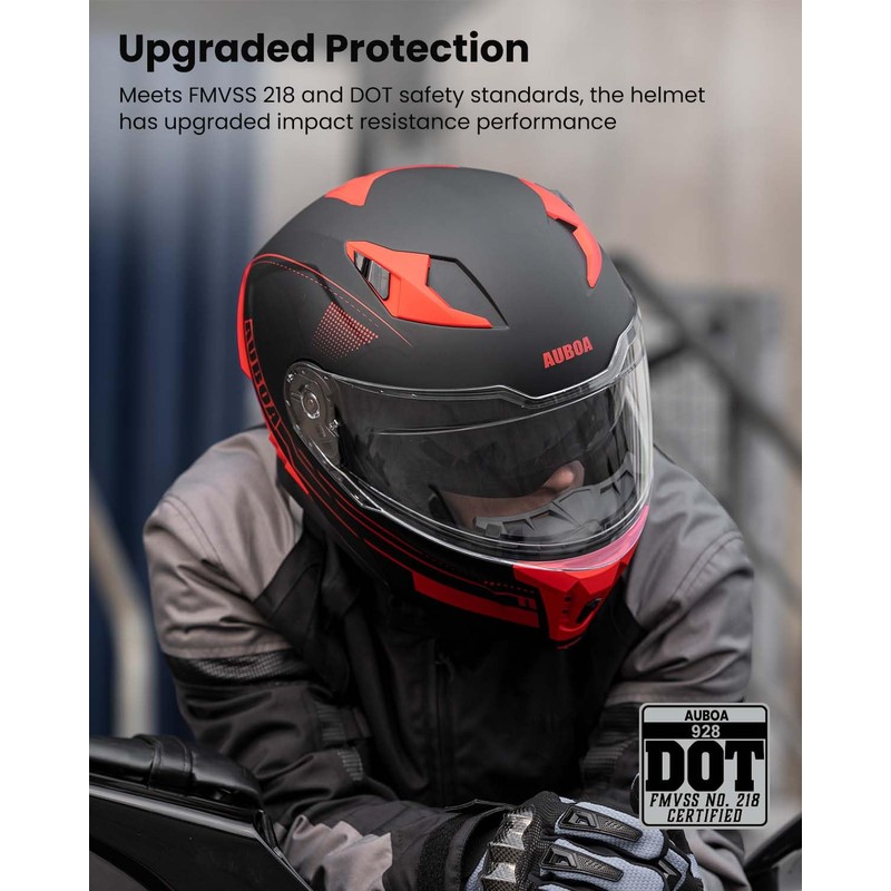 - Enhanced Safety Standards: The Auboa 928 motorcycle helmet meets FMVSS 218 and DOT safety standards. The dual visor system offers a large, clear field of view and reduces glare damage.