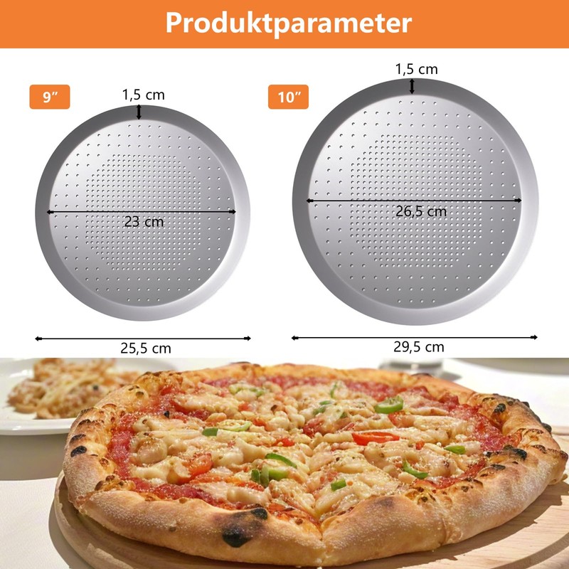 - Box contents: 2 x 10 inch pizza trays (D: approx. 29.5 cm at the top edge and 26.5 cm at the bottom, 1.5 cm height) designed for everyday use, pizza baking pans will be useful in any household, perfect in any standard ovens