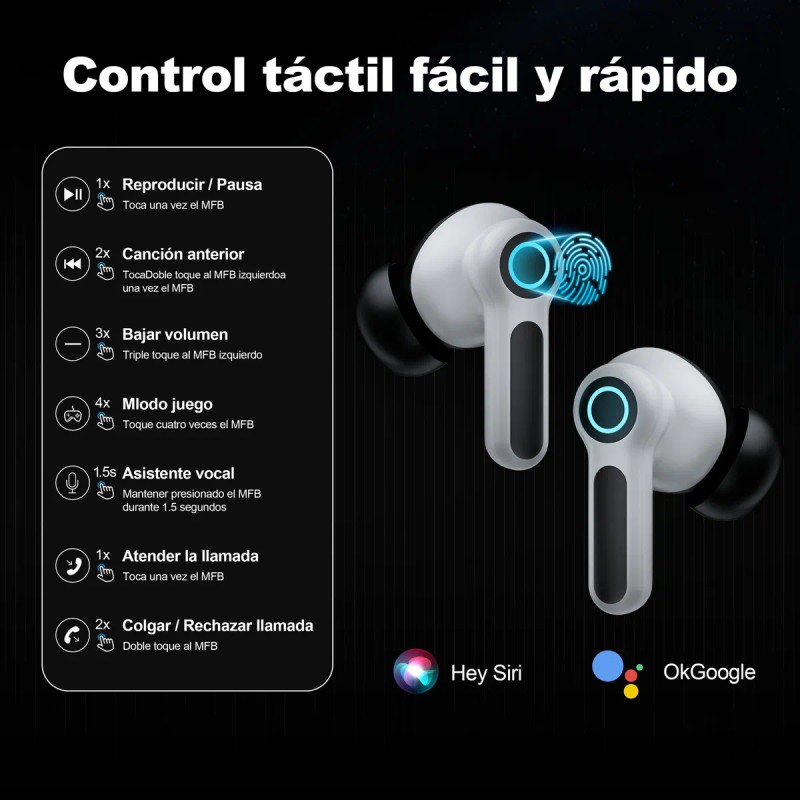 Carga Rápida y Asistentes de Voz: 10 minutos de carga proporcionan 120 minutos de uso, ideal para reponer energía rápidamente. Además, se pueden activar Siri y Google Assistant con solo un toque, facilitando el control hands-free.