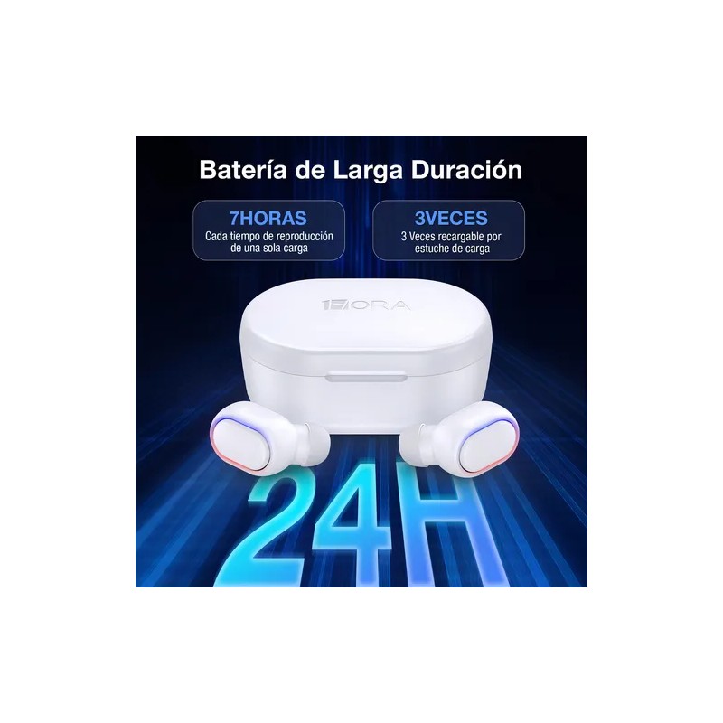- 1Hora A8s TWS en color blanco ofrece una duración de batería de 6 horas para una experiencia inalámbrica prolongada.